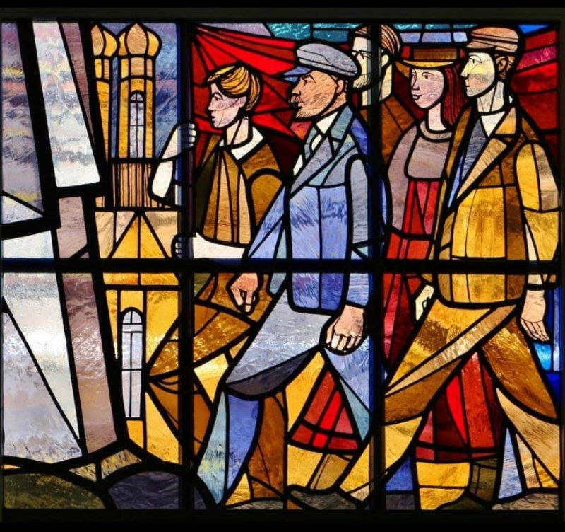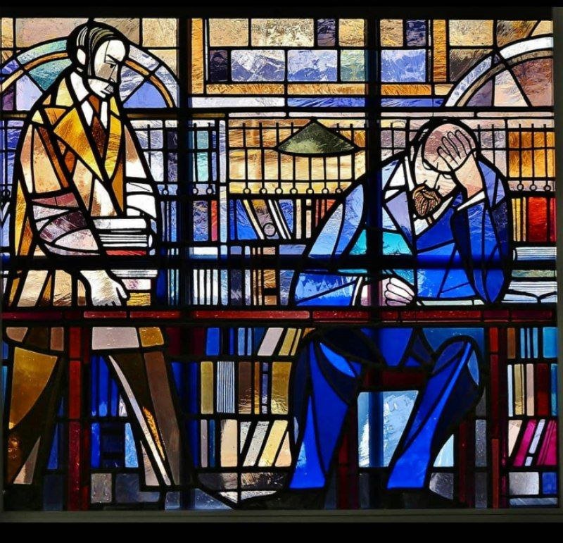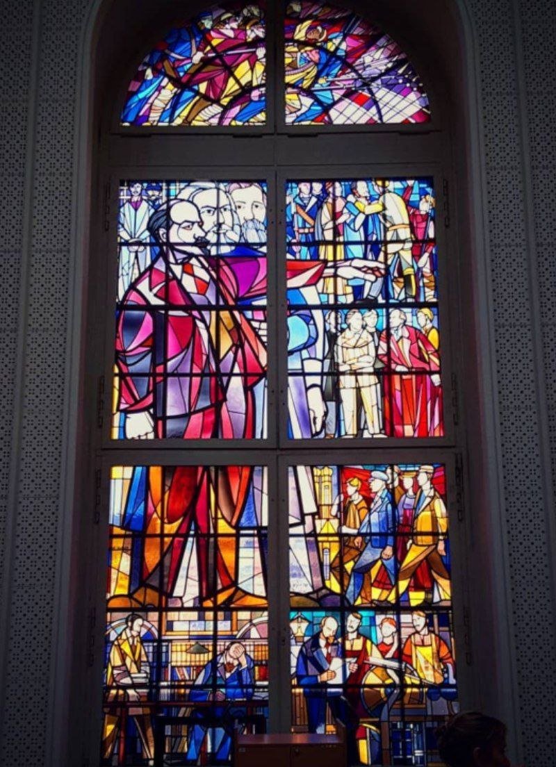 Снаружи, из-за особенностей окна, витраж не виден. Но внутри огромный Ленин продолжает нависать над будущими немецкими юристами.
